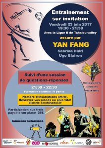 Le vendredi 23 juin 2017, de 19h30 à 21h30, un entraînement sur invitation avec la Ligue B de Tchalou Volley, assuré par Yan Fang, Sabrina Didri et Ugo Blairon est organisé au Hall des sports de Chapelle-lez-Herlaimont (Chaussée de La Hestre – 7160). Cette activité sera suivie par une séance de questions-réponses, de 21h30 à 22h30. PAF : 25€ payable sur place. Renseignements et inscriptions par email (blomme_sarah@yahoo.fr) ou téléphone (0473/68.11.63). Caméras autorisées. Activité validée par 5 points de formation continue.