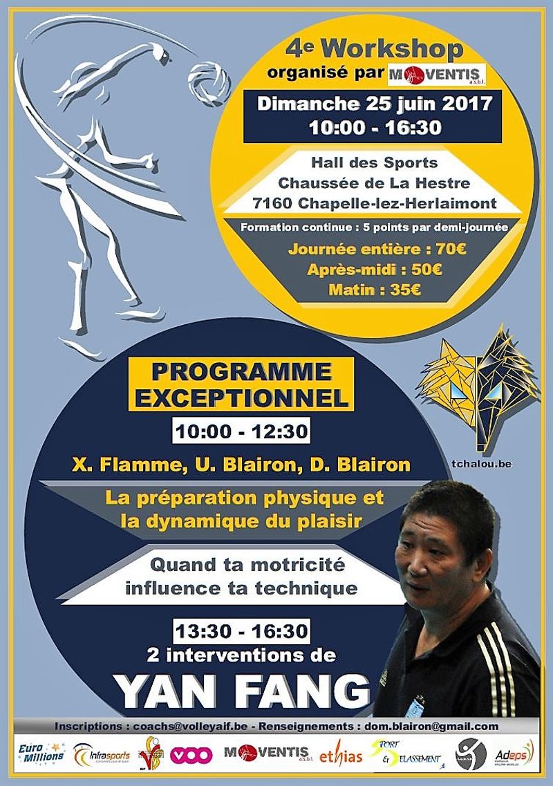 Le dimanche 25 juin, l’Asbl Moventis organisera son 4ème workshop. Celui-ci comprendra deux activités : (1) de 10h00 à 12h30, un clinic sur le thème ‘La préparation physique et l a dynamique du plaisir’ ; (2) de 13h30 à 16h30, un atelier sur le thème ‘Quand ta motricité influence ta technique’. Ces deux activités seront proposées par Yan Fang, Xavier Flamme, Ugo Blairon, Dominique Blairon. PAF : 70€ pour la journée entière, 35€ pour la matinée, 70€ pour l’après—midi. Inscriptions : coachs@volleyaif.be. Renseignements : dom.blairon@gmail.com. Valorisation pour la formation continue : 5 points par demi-journée.